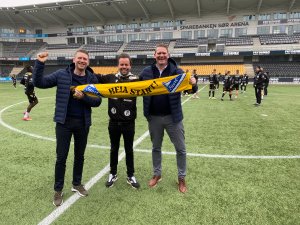 Leder for samfunnsansvar i Start, Espen Børufsen, her sammen med to av spillerene på Gatelaget, holder fornøyd opp pengesjekkene de ble tildelt på årsmøtet i forrige uke.