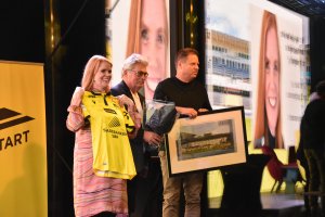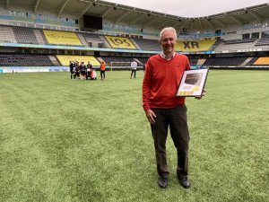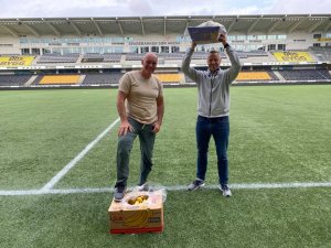 Her står Gunnar Vikeså på Sparebanken Sør Arena med beviset på at Norengros Gustav Pedersen AS er Starts første ærespartner. Foto: Egil Olsen.