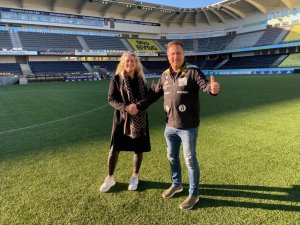 Klubbdirektør Terje Marcussen er strålende fornøyd med at Bemanningsbyraaet, her representert ved seniorrådgiver Nina Håland, har inngått samarbeidsavtale med Start.