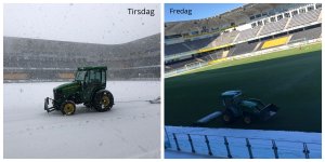 Tidligere i uka var banen på Sparebanken Sør Arena dekket av et tjukt lag med snø. I dag er den helt bar.