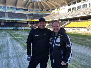 Erlend Segberg og Joey Hardarson gleder seg over at kunstgresset på Sparebanken Sør Arena blir byttet nå.
