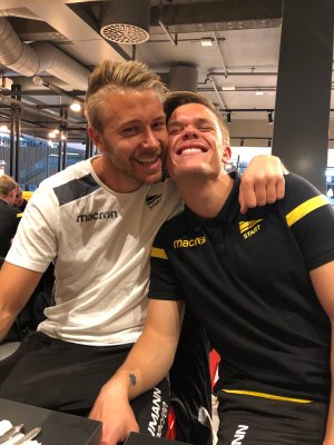 Både Henrik Robstad og Eirik Wichne har bursdag i dag! Med tre poeng på Sotra hadde guttene lov til å feire litt på flyplassen!