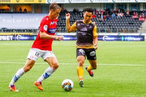 Dagens starter, Daniel Aase, stod bak begge scoringene og leverte en god kamp da Mjøndalen ble slått 2-1 på Sparebanken Sør Arena. (Foto: NTB Scanpix)