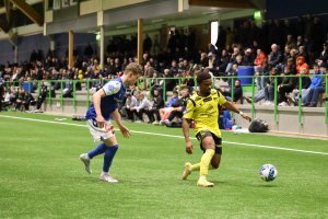 Alagie Sanyang (t.h.) scoret de to første målene i vår 0-3 seier mot Vindbjart fredag kveld. Mathias Grundetjern scoret det tredje. (Foto: Tor-Erik Schrøder)