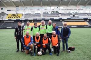 Gåfotball-gjengen har trening hver mandag på Sparebanken Sør Arena. Her er spillerene samlet med Start-legendene Espen Børufsen og Trond Pedersen.