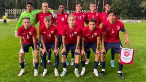 Fire unge Start-gutter var tatt ut til å representere sitt land og kull i septembers landslagssamling, og ytterligere én skal i aksjon. For G17-landslaget ble vår midtstopper Jesper Gravdahl (nr. 2 stående f.v.) kåret til banens beste mot Danmark. (Foto: Esben Hansen / NFF)