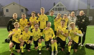 Jublende Start G17-gutter etter lørdagens 5-2-seier over Brann i treningskampen i Stavanger – bak f.v.: Sander Eikeland, Pawel Tytyk, Jonas Tandberg Myrhstad, Daniel Rokseth, Jon Finsådal-Kristensen, Aleksander Kovac, Henrik Haraldsen, Eskil Emil Møllen og Eirik Moen Eskedal (trener). Foran f.v. Lukas Gausdal, Nicolai Apland, Lazar Odor, Daniel Gummedal, Dennis Myrvold og Tias Eftevaag.