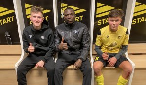 Fabian Østigård Ness (t.v.), Alagie Sanyang og Fredrik Berge scoret målene da Start slo Vindbjart 3-1 i fredagskveldens treningskamp på Sparebanken Sør Arena. Pauseresultatet var 2-1.
