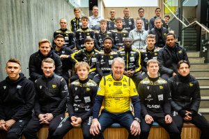 Den meritterte fotballprofilen Åge Hareide holdt torsdag foredrag for blant andre Starts spillere, trenere og støtteapparat på partnerfrokosten hos Lyskomponenter på Mjåvann industriområde – første rekke f.v.: Bjarni Mark Antonsson, Jon-Helge Tveita, Levi Eftevaag, Åge Hareide, Herman Seierstad Johnsen og Sander Sjøkvist. Andre rekke f.v.: Eirik Schulze, Mark Fabricius Jensen, Emir Derviskadic, Salim Nkubiri, Alagie Sanyang, Marius Nordal og Zakaria Sawo. Tredje rekke f.v.: Mathias Grundetjern, Sander Svela, Sander Richardsen, Jesper Gregersen, Endre Eide (assistenttrener) og Vito Wormgoor. Bakerste rekke f.v.: Tom Strannegård, Rune Hægeland (materialforvalter), Emil Grønn Pedersen, Henrik Robstad, Sindre Tjelmeland (hovedtrener), Luc Mares og Jasper Silva Torkildsen. (Foto: Tor Erik Schrøder)
