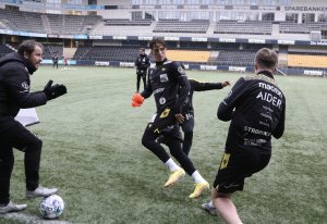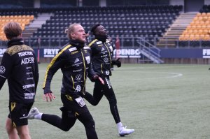 Mathias Grundetjern har trent veldig godt siden Start-spillerne skiltes i november. 22-åringen fra Flekkerøy fremstår både større, sterkere og hurtigere. Her er han i aksjon på Sparebanken Sør Arena der Start kunne trene torsdag. De øvrige på bildet er Tom Strannegård (med ryggen til) og Alagie Sanyang. (Foto: Svein Grundetjern)