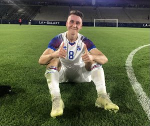 Tre år etter sin forrige A-landskamp er Bjarni Mark Antonsson inne i varmen hos landslagssjef Arnar Vidarsson (44) igjen. I går, to dager etter han fylte 27 år, ble Start-spilleren tatt ut i troppen som skal møte Estland og Sverige henholdsvis 8. og 12. januar. (Foto: Þorgrímur Þráinsson)