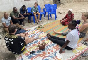 Espen Børufsen (med ryggen til) fra Start Life Support sammen med representanter fra OCODE og Strømmestiftelsen på hjemmebesøk hos Bonga-elev «Joseph» og hans familie i Dar-es-Salaam. (Foto: Maren Nuland Marcussen)