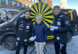 Her deler Cameron Cresswell (t.v.) ut premie til Oliver (12) da Start i november hadde lykkehjul på Nedre Torv i Kristiansand. Det skulle bli det siste den 23 år gamle briten gjorde for Start, klubben han på halvannet år ble veldig glad i. T.h. står Camerons lagkamerat og gode venn, Sander Sjøkvist. (Foto: Egil Olsen)