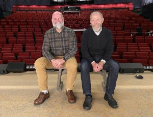 Start-legendene Trond Pedersen (71) og Paul Richardsen (61) på scenen i Kilden teater og konserthus, der de denne uken debuterer som profesjonelle skuespillere i Asbjørn Arntsens julemusikal «Like til Betlehem». (Foto: Egil Olsen).