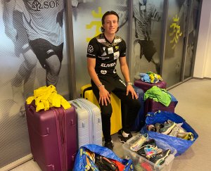 Her sitter Sander Sjøkvist på et «kaos» av kofferter og poser fulle av fotballutstyr. Neste stopp for Start-spilleren og innholdet er Start Life Supports fotballprosjekt i Dar es Salaam i Tanzania. (Foto: Egil Olsen)