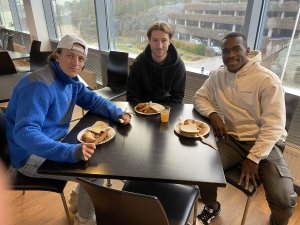 Sander Sjøkvist (f.v.), Cameron Cresswell og Basilio Ndong var blant spillerne som i dag deltok på Starts noe tidlige julelunsj i Klubbhuset på Sparebanken Sør Arena. (Alle foto: Egil Olsen).