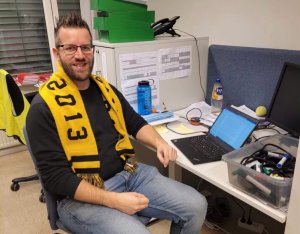 Martin Ask Holthe (36) er fra Kristiansand, men har de siste 17 årene bodd i Oslo. Nå har han fornyet sesongkortet på Sparebanken Sør Arena for 2023. Her er den gode Start-supporteren fotografert på Engebråten ungdomsskole, der han jobber som lærer. (Foto: Privat)