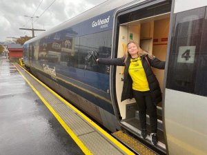 Etter å ha slitt med depresjon og angst var Caroline Horpestad søndag på Sparebanken Sør Arena for tredje gang på fire år. Her ankommer Sira-kvinnen Kristiansand stasjon med 11.45-toget fra Stavanger. (Foto: Egil Olsen)