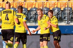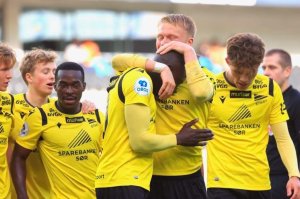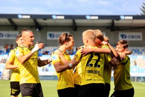 Joakim Holtan, vår mann fra de indre bygder, scoret i dag i sin femte kamp på rad. Her gratuleres storscoreren av Vito Vormgoor, Zakaria Sawo og Emir Derviskadic. (Foto: Tor Erik Schrøder, NTB).