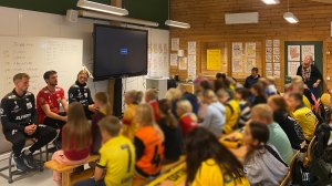 Start-spillerne Joacim Holtan (t.v.) Mark Jensen og Mathias Grundetjern foran lydhøre 6.-klassinger på Presteheia skole.