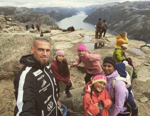Vito Wormgoor og de fem jentene hans på Preikestolen, turistattraksjonen og fjellplatået i Lysefjorden i Rogaland – Vienna (t.v.), Novi, Mila (foran) og kona Naomi med lille Lua på ryggen. (Foto: Privat)