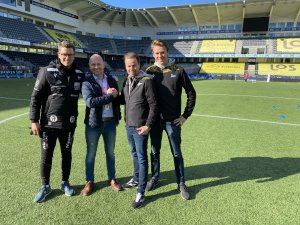 Sindre Tjelmeland (Starts hovedtrener - f.v.), Atle Hodne (regionsjef for Region Sør-Norge i Hennig-Olsen Is), Kristian Westgaard (salgssjef i Start) og Markus Slyngenborg Jensen (salgs- og markedsmedarbeider i Start) samlet på tirsdagens Start-trening på Sparebanken Sør Arena. (Foto: Egil Olsen).