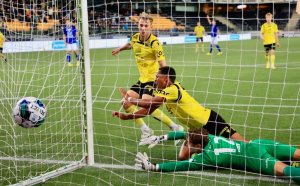 Etter en intens sluttspurt var det Start som beholdt alle tre poengene i toppkampen mot KFUM Oslo, da Joacim Holtan satte inn 3-2 på overtid (bildet). Foto: Tor Erik Schrøder.
