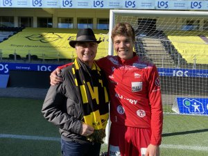 Bjøro Håland sammen med Jasper Torkildsen på Sparebanken Sør Arena. På revyen «2x45» i Teateret i Kristiansand 29. oktober skal begge opptre. Country-stjernen skal synge «Start Fan» - Start-keeperen skal lese dikt. (Foto: Egil Olsen).