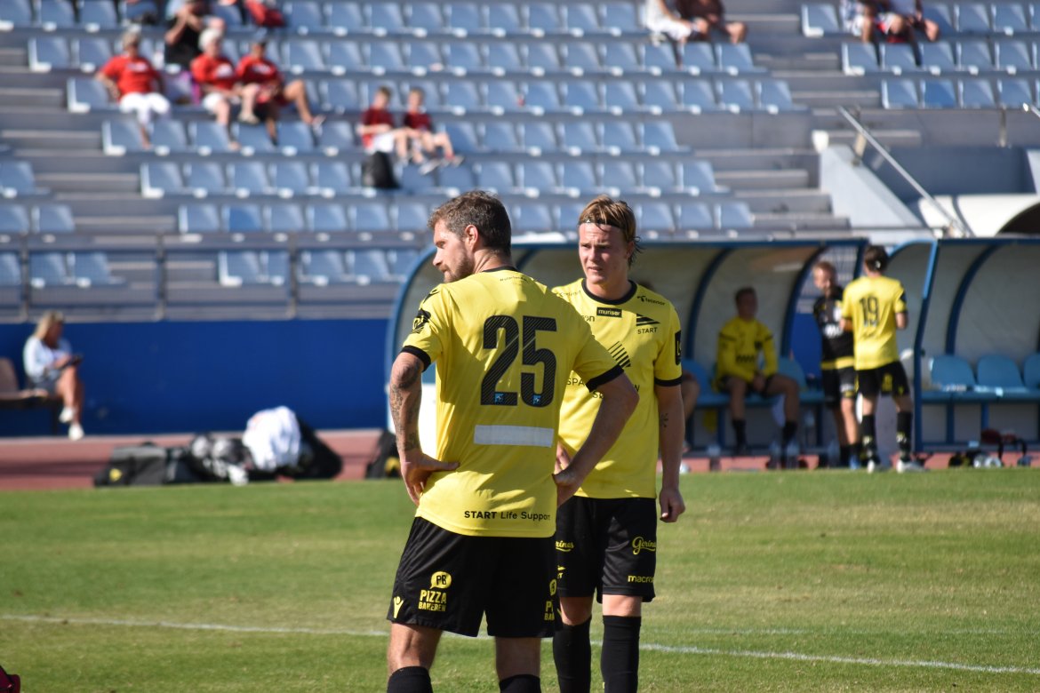 42 min: 1-0 til Start! Tobias Christiansen spiller opp Kevin Kabran, han flikker gjennom Matthias Bringaker som setter ballen i mål.