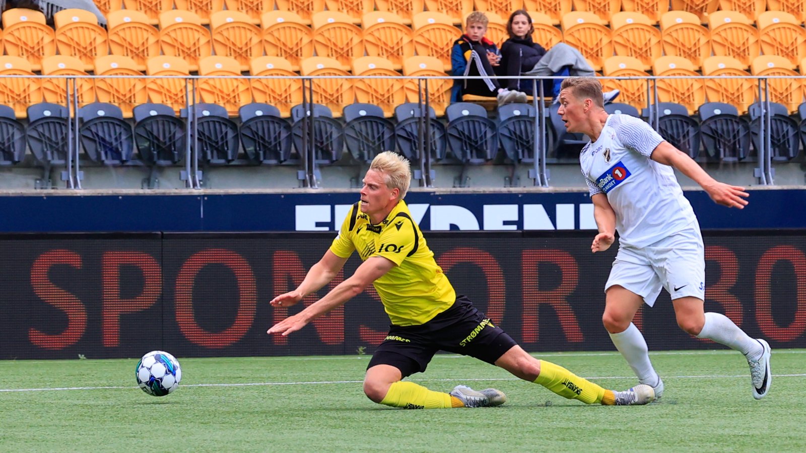 41 min: Stabæk kontrer, men Mark Jensen er ute og takler nesten ved innbytterbenken – til stor jubel fra hjemmefansen.